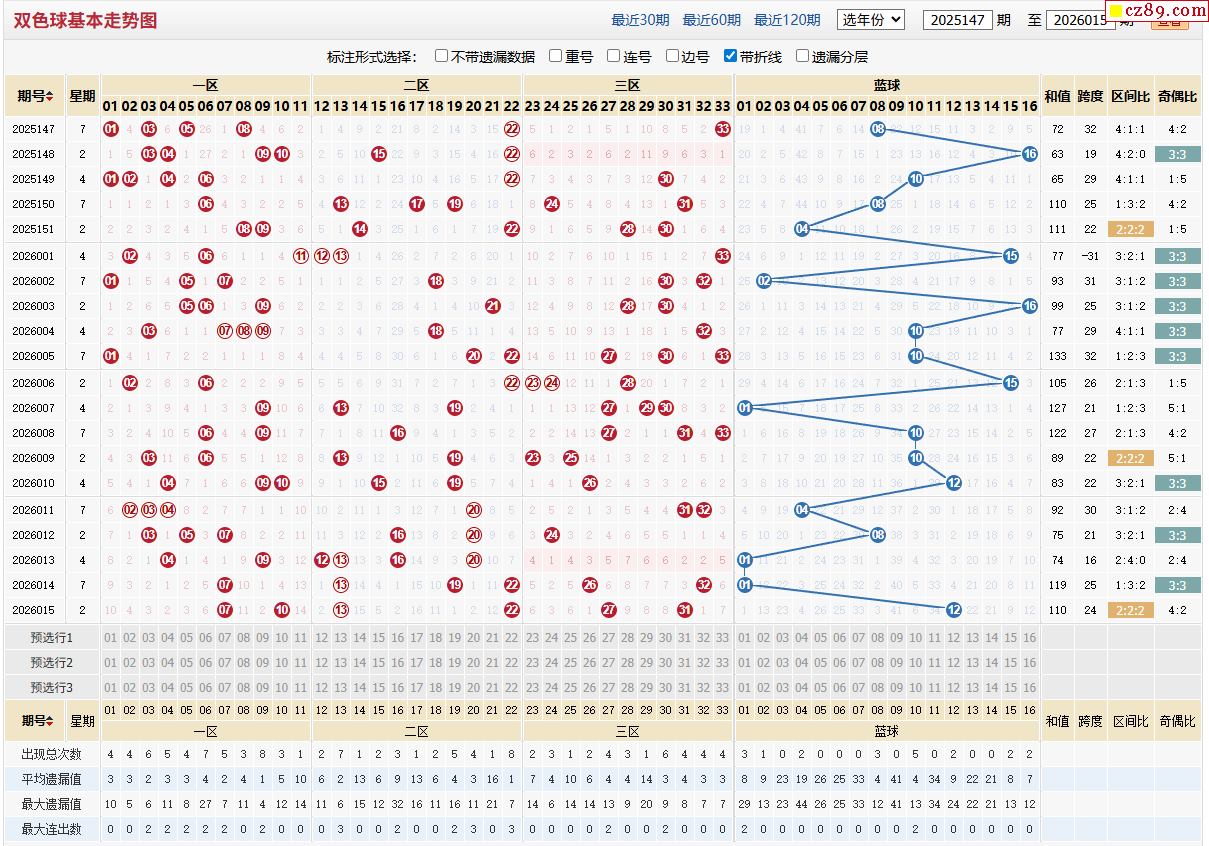 > 016期福彩双色球近期走势图分析
